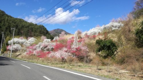 富山県から友人が来てくれました。ビックリ‼️上の写真は彼女が野麦峠近くの境峠で遭遇した雪降り‼️ 凍みてなくて良かったね。記念ショット頂きました。ガラッと変わり下は今日午後の自宅付近の景色。枝垂れ桃や花桃が咲き揃い見事です。毎日こういう景色を眺めながら過ごす暮らし しあわせです。