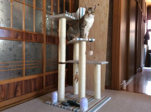 母屋下の敷地の半分を染めの干し場にするのに枯れ草と根っこの始末をしていましたが、余りにも根っこが深く広く全部取りきれない! で、一部防草シート広げて暫く凌ぐ事にしました。ようやく染めの作業本格的に再開です。布の両面が生成りと白になっているリネンガーゼとリネンラミー混紡生地の煤染めです。ちいに2台目のキャットタワー。早速遊び始めてくれてヨカッタ〜。