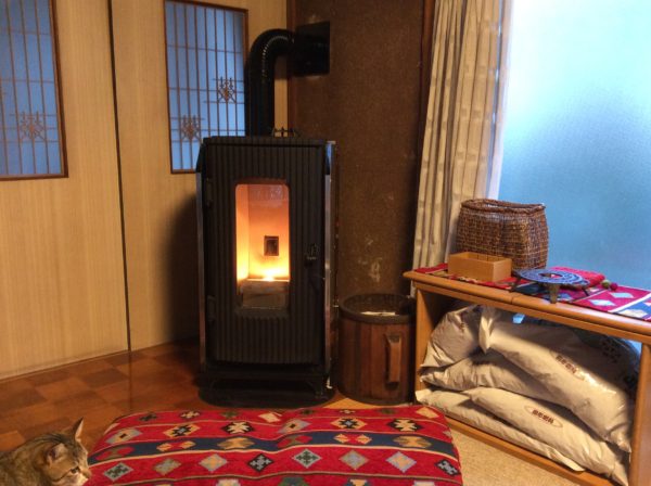 設置は壁に穴を開けて排気管を通して接続するだけの簡単な作業との事。薪ストーブのように壁や床に断熱材の設置は必要ない。そのかわり、煙突や本体全体からの輻射熱は無くて排気管は少し暖かい程度、鋳物の本体の前面と上部からの輻射熱で暖められるという具合だ。一気に暖める事は出来ないので、ファンヒーターを20分程つけておいて着火材(木材チップ)にライターで火をつけ、ペレットの量を調整しながらストーブの火を安定させる。ボタンひとつで…ではない。しかしこんなアナログなのが嬉しく、安心だと感じている。