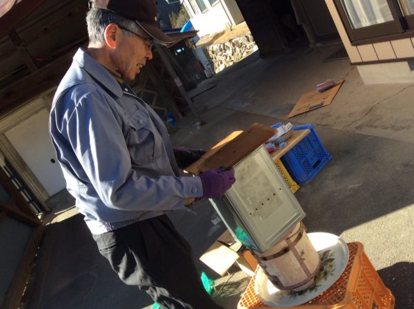 霜で真っ白な朝、氷点下の気温も日常的になったのに、薪ストーブかペレットストーブか決められずにいた。11月末に隣の宮田村農協の農業祭でペレットストーブの展示があり、詳しい説明を受け見積もりを出して頂いた。同時に、駒ヶ根市赤穂に18年前からログハウス暮らしをしている友人宅の薪ストーブを拝見、体験して色々話を伺い憧れだけでは無理と判断。ペレットストーブを設置する事にした。燃やす固形燃料は上伊那森林組合が製造しており、この地域に多く植林されている赤松と唐松を材料にしている事が良い印象を受け、しかも薬品等は使わずに砕いたチップを圧縮して固形燃料にしているので燃やしても安心安全なのが嬉しい。