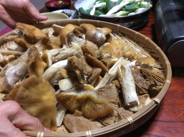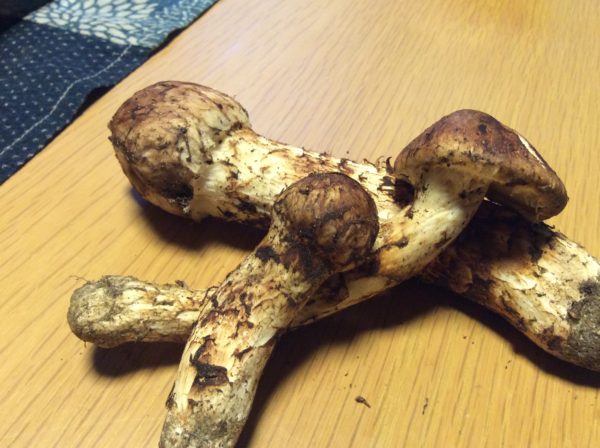 日向の池上節子さんが「ちょ登ってキノコ見に行こうか」と誘って下さり春にワラビを採りに登って行った道沿いの山に入った。先客があったようで塩漬け用のキノコを少々と栗を拾い戻って来た。 ん?玄関先のテーブルに何かある….袋の中はいっぱいのキノコ! ズボウと松茸しかわからないが。誰?そりゃ仙人でしょ! 下ごしらえの仕方教えるからと来てくれ大きくて黒っぽい奇妙なカタチのは香茸とわかった。産直に並んでいるのは小さくて別ものだった。