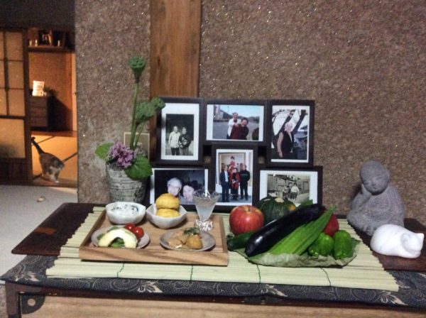 我が家にはお仏壇は無く、敢えて事をしなくても日々心の中で「ありがとう」を念じ、夫ととの会話では結構亡き人たちが登場するのでそれがご供養になっていると思っている。とはいえ、店先で見たことのないお盆用のあれこれが並び、ちょっと真似ごとしたくて13日の迎え火、お供えをして江本家、河上家のご先祖様をお迎えした。