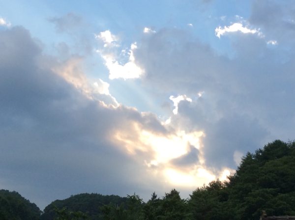 お盆が過ぎ17日の朝は寒くて肌布団に潜り込んだ。昨夜の大雨後の爽やかな空気と陽射し。いつもの雨上がりと違う吹く風は、日陰ではなく日向へと誘うほどひんやりしている。