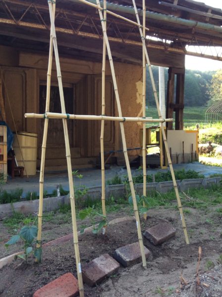 5月に入った。産直やホームセンター園芸コーナーの野菜や花の苗を求めに大勢の人が訪れている。天竜川近くにある産直でキュウリの苗を3本とボタンコショウの苗を2本買って来た。キュウリは「接ぎ木だから強いよ。」と店長さんが説明して下さり、素人でも出来そうな気になってしまった。敷地下の畑予定地の開墾が間に合わなく、母屋前の庭は花壇として整えるつもりがだんだんと野菜が増えだした。