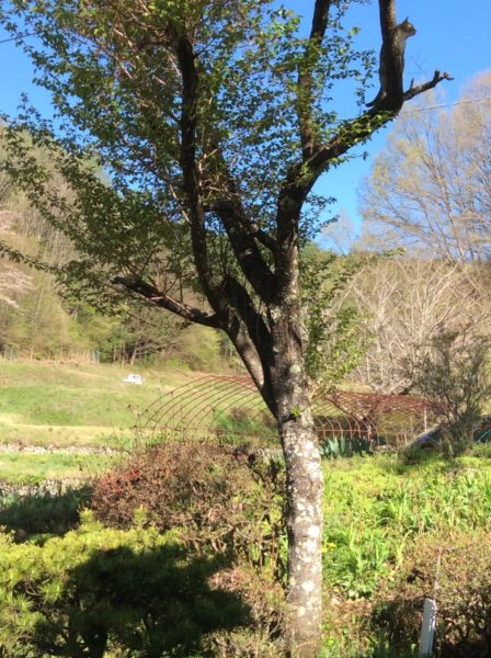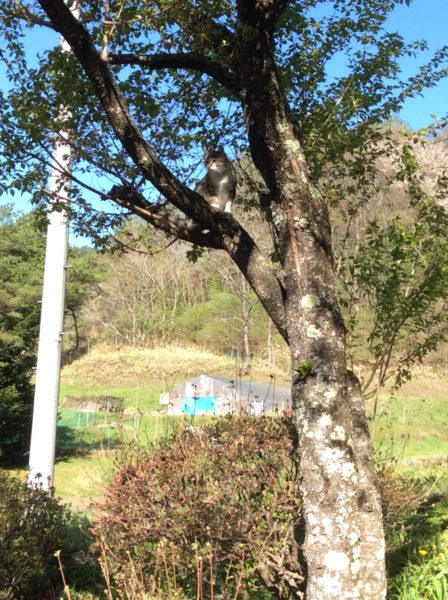 ちいがコヒガンザクラの3m程の幹を一気に登った。枝の位置を変えては辺りを伺っていた。そう言えば、チーターという木登りが得意な親戚さんがいたね。何が見え何が聴こえているんだろう。毎日外の探検、見回りに出かけ山の暮らしをそれなりに楽しんでいるようだ。ネコは環境の変化に敏感だと聞いていたので実はこの事が一番の気がかりだった。