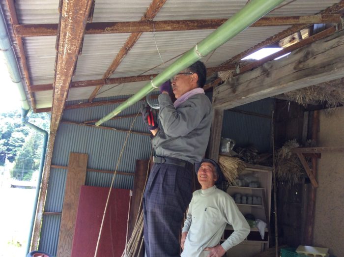 《物干し竿じゃ味気ない、と師匠。ちゃっと軽トラ走らせ竹を切ってきてこのとおり。お見事!》
